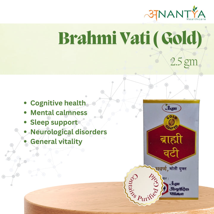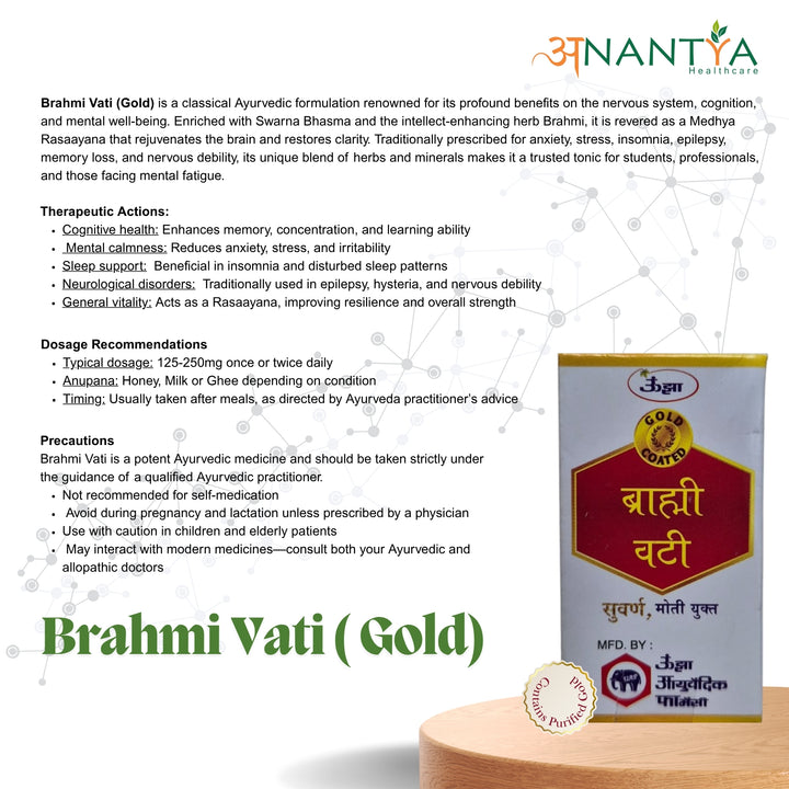 Unjha Brahmi Vati (Swarnyukt) is a classical Ayurvedic formulation enriched with Brahmi (Bacopa monnieri) and fortified with Swarna Bhasma (purified gold ash). Revered as a Medhya Rasayana (nootropic and brain rejuvenator), it supports memory, concentration, and mental clarity while calming stress, anxiety, and insomnia. Traditionally prescribed for neurological and psychosomatic disorders, it exemplifies Ayurveda’s precision in harmonizing the mind, strengthening the nerves, and restoring overall vitality.