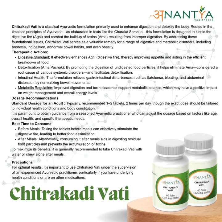 Chitrakadi Vati is a classical Ayurvedic formulation renowned for its role in enhancing digestion and clearing toxins. Referenced in authoritative texts like the Charaka Samhita, it is designed to kindle Agni (digestive fire) and reduce Ama (toxic buildup), addressing the root of many digestive and metabolic concerns.