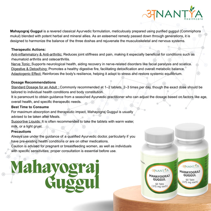 Mahayograj Guggul is a classical Ayurvedic formulation prepared with purified Guggul (Commiphora mukul) and a synergistic blend of potent herbs and minerals. Revered for centuries, it is designed to balance the three doshas while rejuvenating the musculoskeletal and nervous systems.