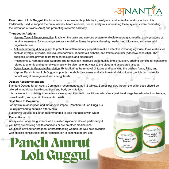 Panch Amrut Loh Guggul is a classical Ayurvedic formulation valued for its phlebotonic, analgesic, and anti‑inflammatory properties. Traditionally prescribed to nourish the brain, nerves, heart, muscles, bones, and joints, it helps clear Ama (toxins) and restore systemic balance by harmonizing the three doshas.