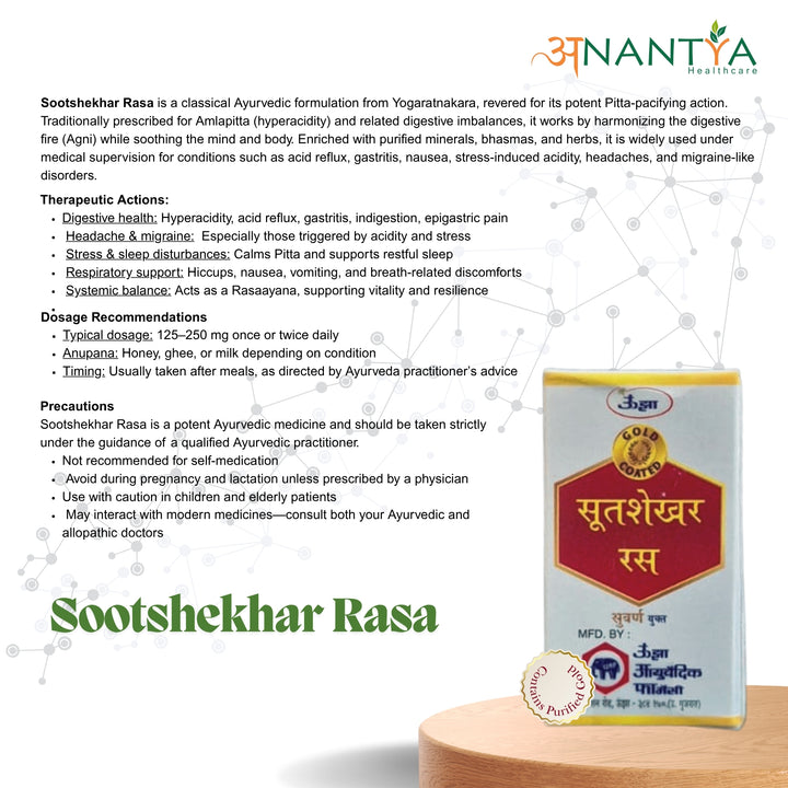 Unjha Sootshekhar Ras (Swarn Yukt) is a classical Ayurvedic formulation renowned for its powerful Pitta-pacifying action. Traditionally prescribed for hyperacidity, gastritis, nausea, vomiting, headache, and stress-related digestive disturbances, it works by soothing the stomach lining, balancing excess heat, and restoring digestive harmony. Enriched with Swarna Bhasma, Shuddha Parad, Shuddha Gandhak, and supportive herbs like Shunthi and Pippali, it acts as both a digestive tonic and Rasayana, promoting long-term gastrointestinal health and overall vitality.