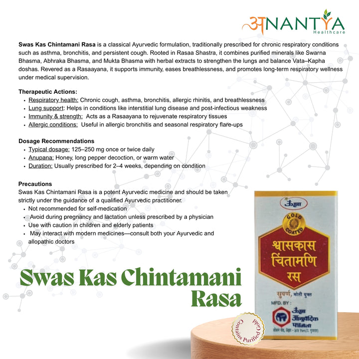 Unjha Swas Kas Chintamani Rasa is a classical Ayurvedic formulation enriched with Swarna Bhasma, Abhraka Bhasma, and purified minerals, traditionally prescribed for respiratory ailments such as asthma, chronic cough, bronchitis, and breathlessness. Revered as a Rasayana, it not only strengthens the lungs but also supports the heart, liver, and overall immunity. By balancing Vata and Kapha doshas, it helps clear congestion, restore vitality, and exemplifies the mastery of Rasa Shastra in transforming precious metals into safe, potent remedies under expert supervision.