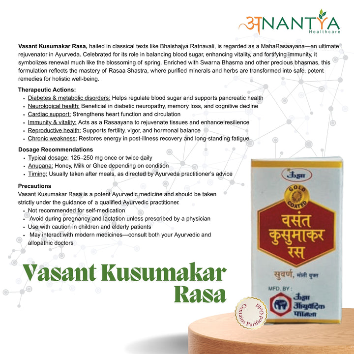 Unjha Vasant Kusumakar Ras is a premium classical Ayurvedic formulation enriched with Swarna Bhasma, Moti Bhasma, Abhraka Bhasma, and other precious minerals, revered as a powerful Rasayana. Traditionally prescribed for diabetes, urinary disorders, debility, respiratory weakness, and reproductive health, it is celebrated for restoring vitality, enhancing immunity, and supporting longevity. By balancing Vata and Pitta doshas, it rejuvenates body tissues, strengthens the heart, nerves, and lungs, and exemplifies the mastery of Rasa Shastra in transforming purified metals into safe, potent remedies under expert supervision.